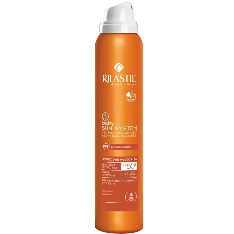 Sun System Photo Protection Therapy Spf50+ Baby Transparent Spray di Rilastil protegge il corpo dalle radiazioni UVB-UVA.